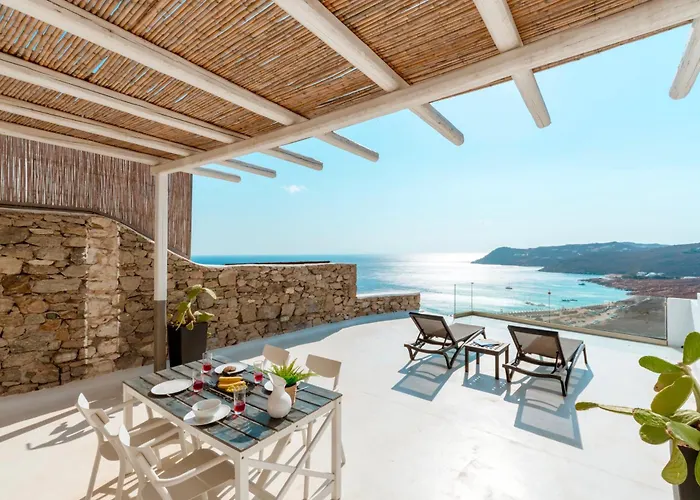 Situada a cerca de 7 km da Rua Matoyianni, pousada Panoramic Aegean Residence At Elia Beach Mykonos - Private & Exclusive Elia à beira-mar convida os hóspedes a relaxar num terraço.